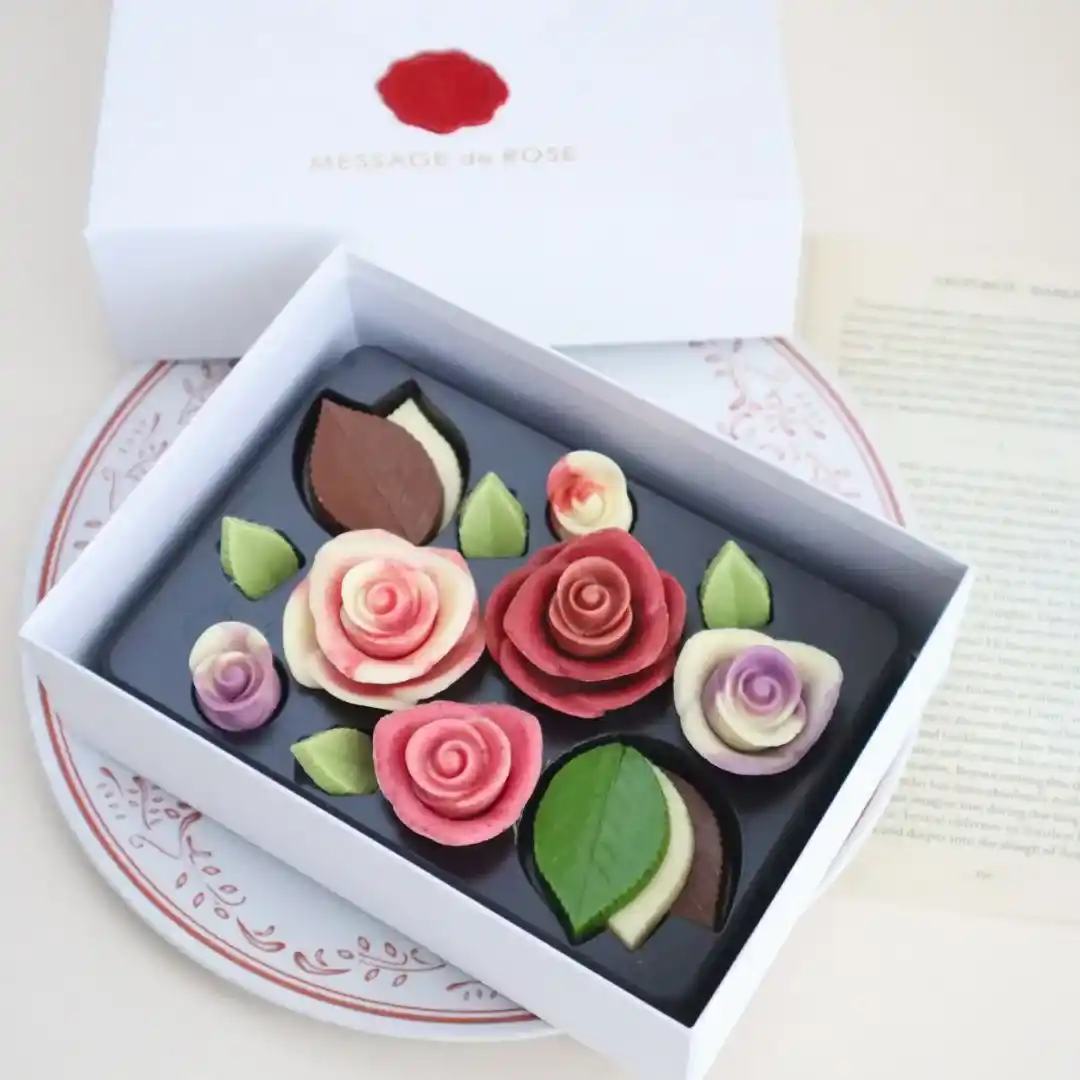 まるで手紙を贈るように、想いを届けられる美しいショコラのギフトです。封筒を模した箱の中には、ダリアカラーの薔薇の形をしたショコラが詰められています。花びらの曲線まで丁寧に再現された芸術的な見た目はもちろん、果実の香りとカカオが調和した繊細な味わいも魅力。甘いものが好きな彼へのサプライズプレゼントに最適です。