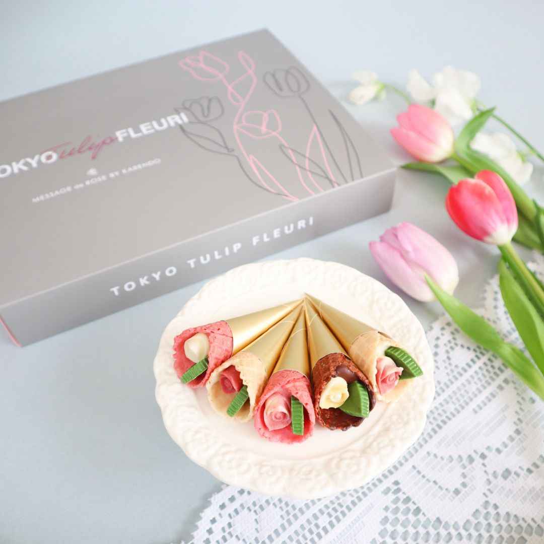 チョコレートの花束のような見た目が魅力のチューリップショコラ10本セット。パリッとしたコーンとフルーティーなバラ型チョコの組み合わせが絶妙。心温まる気持ちを伝えるギフトにぴったりです。