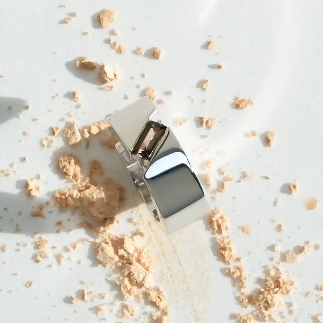 宝石を側面にセットしたアシンメトリーなデザインがユニークなリングです。丸みのある洗練されたフォルムは指なじみが良く、圧迫感なく着用できます。さりげないエッジラインがシャープさも感じさせ、5種類のカラーストーンから好みのものを選べます。自分だけのお守りのような存在になってくれるでしょう。