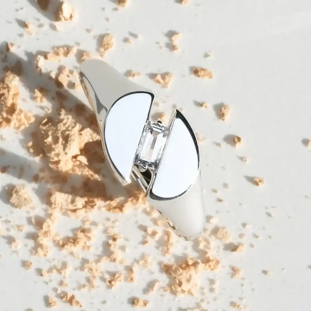 スリット部分で挟み込むように宝石を留めた、遊び心のあるシグネットリングです。オーバル型のシルエットとバゲットカットの宝石の組み合わせが、ユニークな存在感を放ちます。ユニセックスで着用できる洗練されたデザインは、ペアジュエリーにも最適。年齢を重ねた大人の女性の指元に、個性をプラスする上質なアクセサリーです。