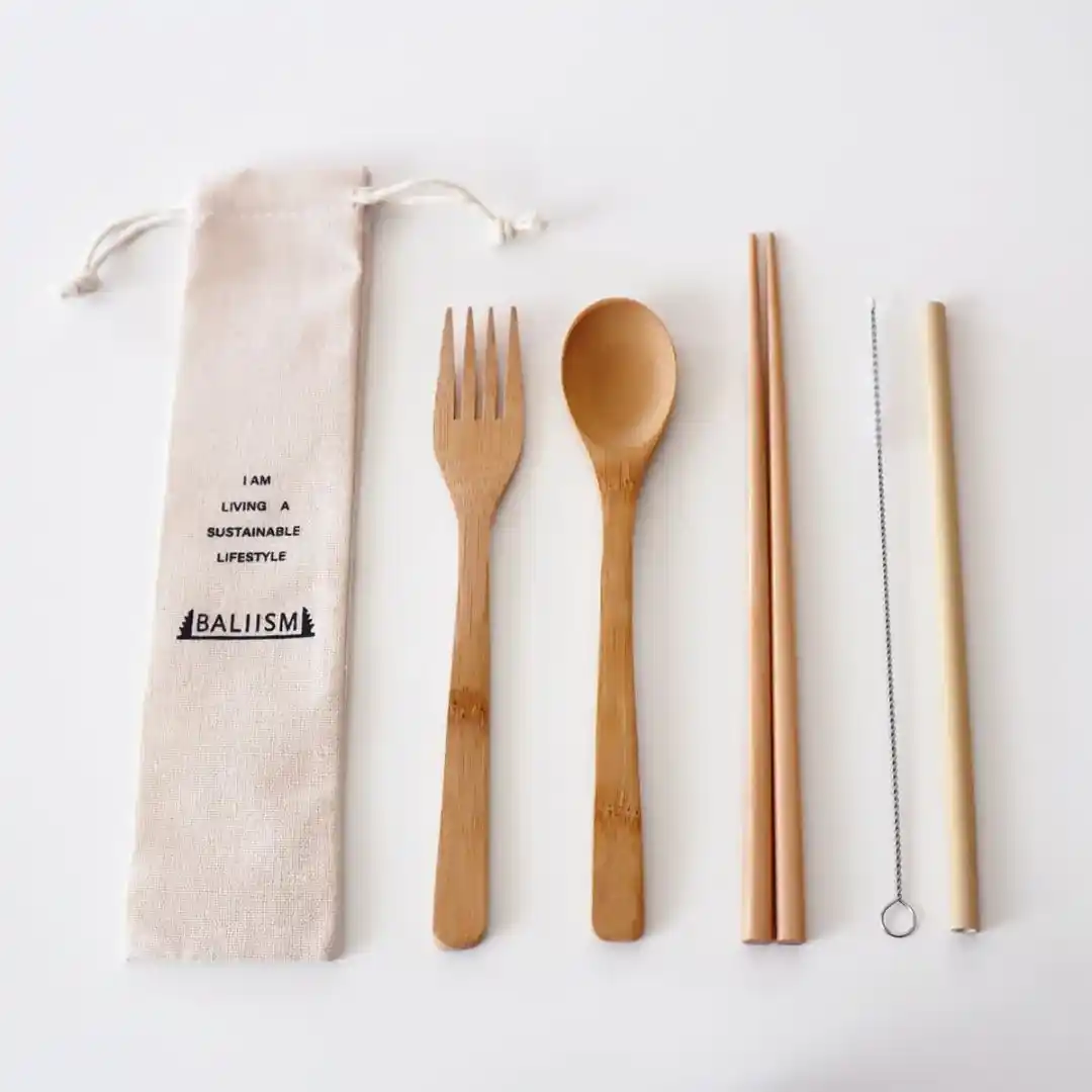 バンブーカトラリーセット(スプーン、フォーク、箸、ストロー、洗浄ブラシ、収納ポーチ) | BALIISM
